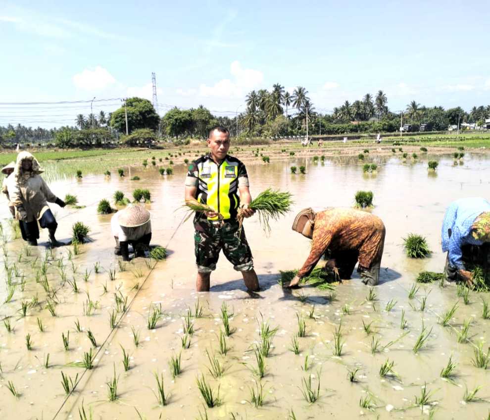 Serma Donner Sipangkar, Babinsa Posramil Peulimbang Kodim 0111/ Bireuen, turun langsung ke sawah membantu masyarakat menanam padi di Desa Uteuen Sikumbong, Kecamatan Peulimbang, Kabupaten Bireuen. Kegiatan ini merupakan bagian dari upaya mendukung program pemerintah dalam mewujudkan swasembada pangan. Minggu (24/08/2025).