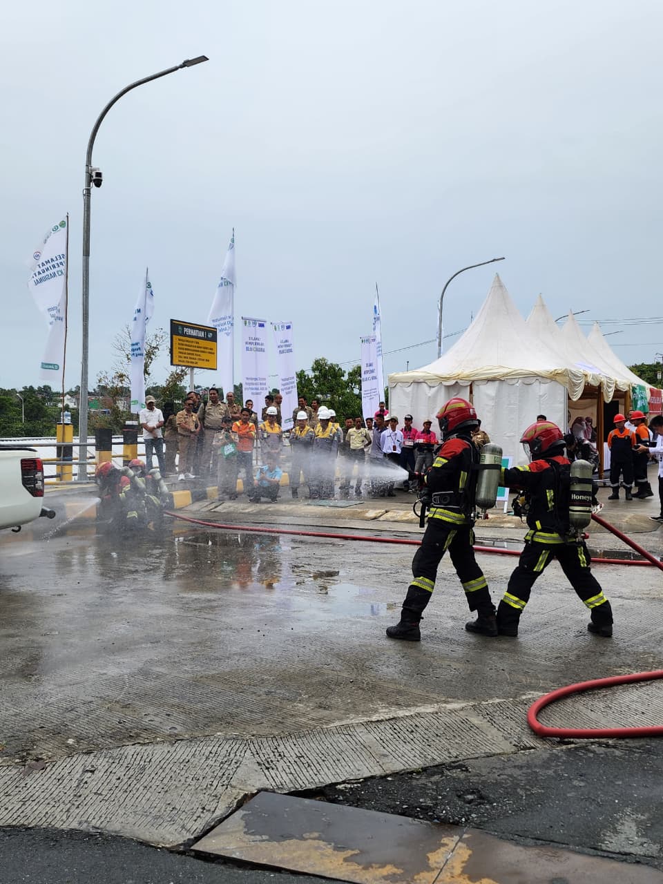 Kegiatan pencanangan Bulan K3 Nasional 2026 ditutup dengan simulasi dan atraksi K3 yang ditampilkan oleh PT Jembatan Muara Bara dan PT Pamapersada Nusantara Site Baya. Simulasi tersebut menggambarkan penerapan standar keselamatan kerja di lapangan secara nyata.