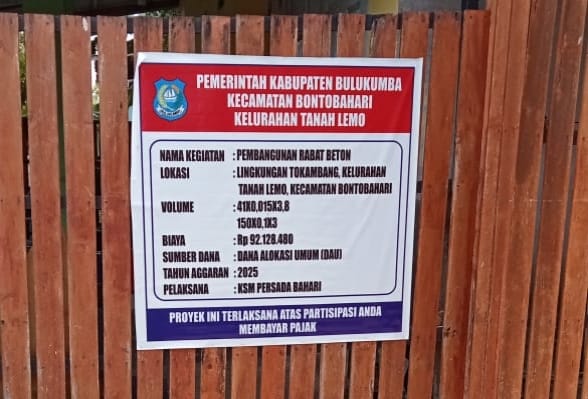 Bulukumba – Proyek rabat beton yang dibangun di Lingkungan Tokambang, Kelurahan Tanah Lemo, Kecamatan Bontobahari, tak ubahnya proyek akal-akalan. Alih-alih menjadi solusi infrastruktur, proyek senilai Rp92.128.480 dari Dana Alokasi Umum (DAU) tahun 2025 ini justru dinilai menyisakan banyak persoalan, mulai dari mutu pekerjaan yang diragukan hingga dugaan kuat praktik manipulatif yang terselubung.