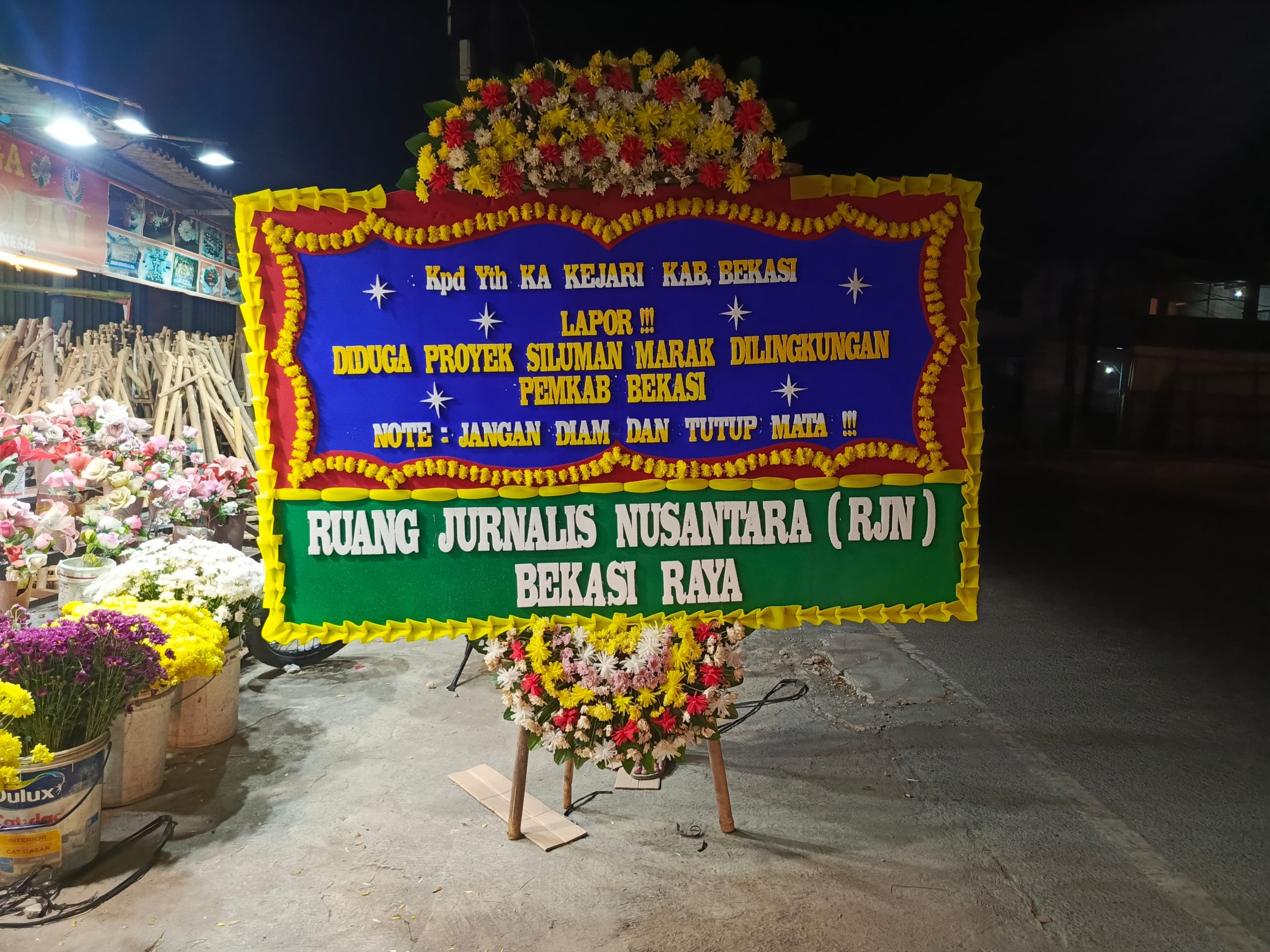MabesNews.com, Bekasi, – Ruang Jurnalis Nusantara (RJN) Bekasi Raya melaporkan adanya dugaan proyek siluman yang marak terjadi di lingkungan Pemerintah Kabupaten (Pemkab) Bekasi. Melalui sebuah papan bunga yang diletakkan di depan Kantor Kejaksaan Negeri Kabupaten Bekasi, RJN meminta penegak hukum agar tidak menutup mata terhadap dugaan proyek-proyek tersebut. Senin, (2/9/2024).