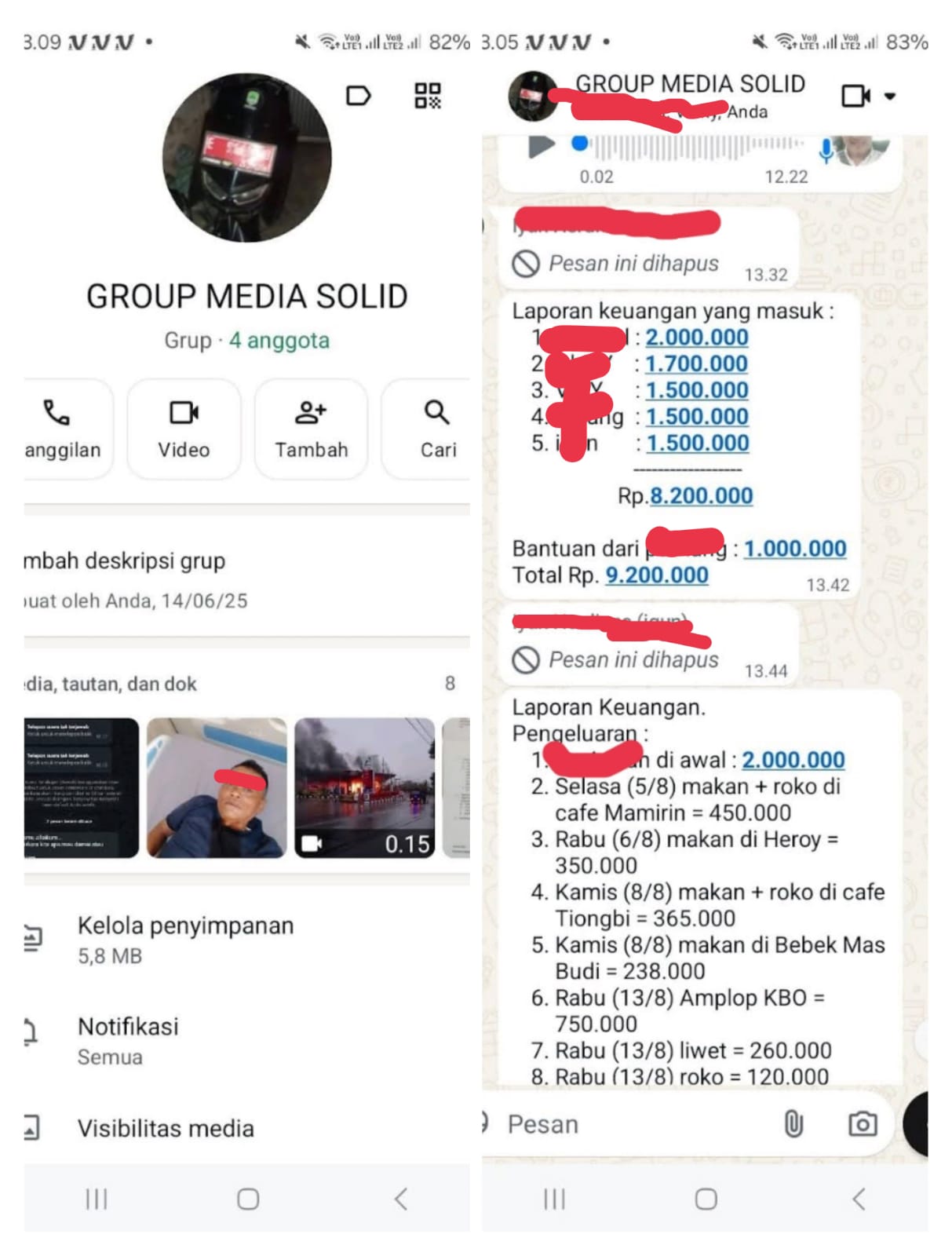 Total Rp. 9.200.000. (keterangan chat WhatsApp ada sebagian yang disensor berdasarkan Kode Etik Pewarta dan Asas Praduga tak bersalah).