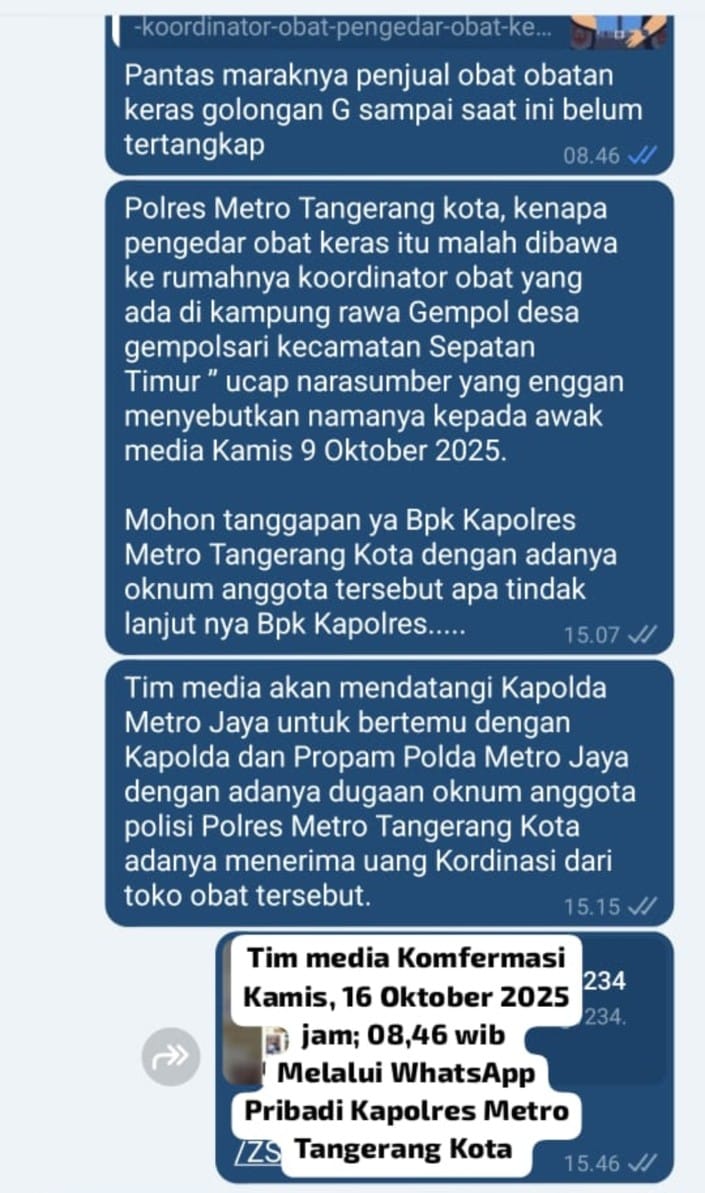 ” Kami sangat menyayangkan tindakan aparat penegak hukum yang tidak langsung membawa pengedar obat keras tersebut ke polres Metro Tangerang kota, namun sebaliknya pengedar obat keras itu malah dibawa ke rumahnya koordinator obat yang ada di kampung rawa Gempol desa gempolsari kecamatan Sepatan Timur ” ucap narasumber yang enggan menyebutkan namanya kepada awak media saat di konfirmasi Kamis 9 Oktober 2025