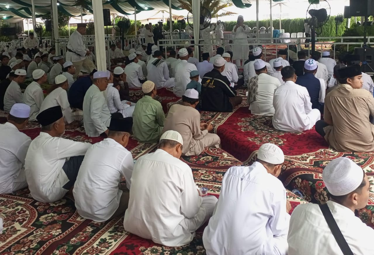 Para tamu mengenakan busana putih-putih duduk bersimpuh di atas karpet menyimak tausiah yang disampaikan Ustadz DR Habib Segaf Hasan Baharun, M.H.I dan para Habaib.