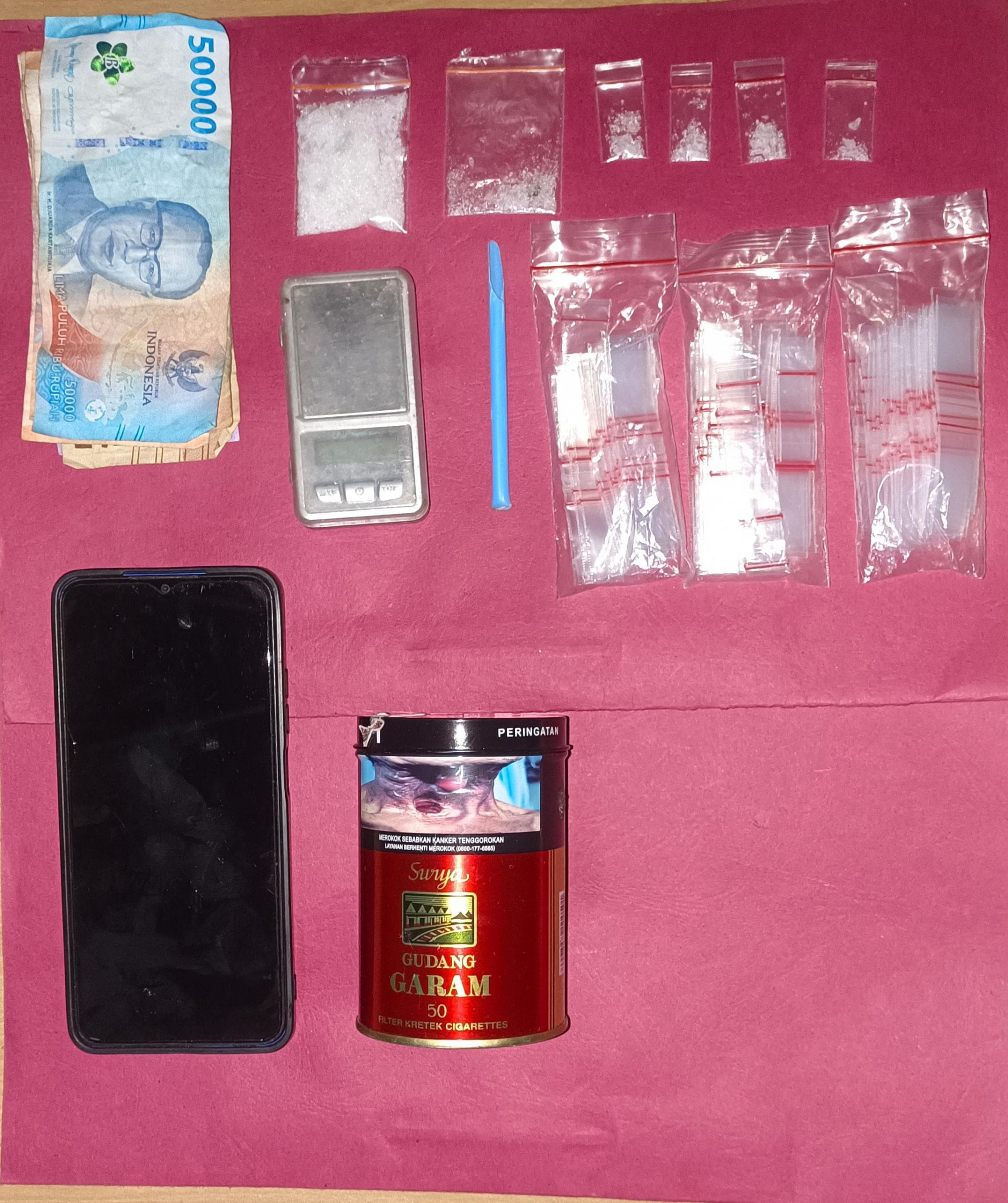 Dari tangan R, polisi mengamankan barang bukti berupa, 6 bungkus plastik klip diduga berisi sabu seberat 5,83 gram bruto,, Uang tunai Rp80.000 yang diduga hasil penjualan sabu, 3 bungkus plastik klip kosong, 1 buah skop sabu dari pipet, 1 unit HP Android merek Redmi, 1 buah timbangan elektronik, 1 kotak kaleng rokok Surya warna merah. Tersangka S juga turut diamankan di lokasi kejadian.