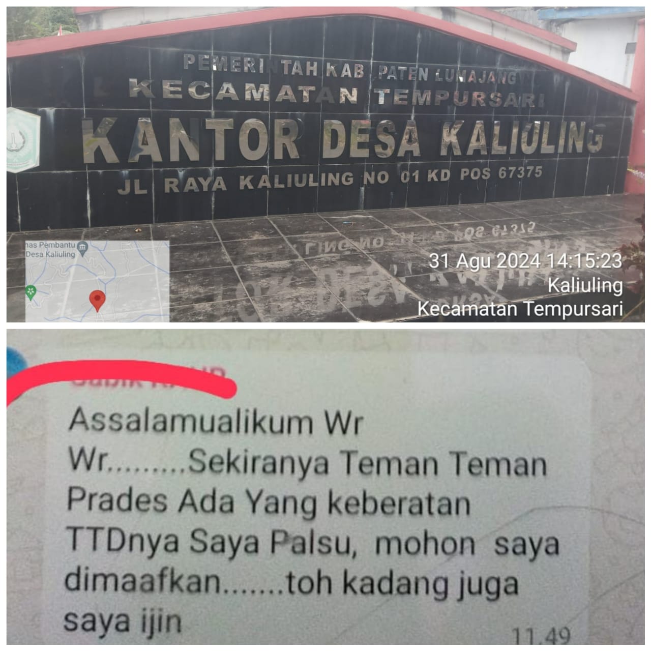 Lebih lanjut tim datangi Sekertaris Desa (SEKDES) guna klarifikasi kebenaran dari rumor yang beredar terkait dugaan pemalsuan tanda tangan. Kepada tim, SEKDES mengaku sejak tahun 2022 akhir sampai 2024 akhir ia tidak pernah lagi dimintai tanda tangan terkait pencairan Dana Desa (DD), dan SEKDES mengaku pernah diminta izin untuk sekali saja dipalsukan atau ditiru tanda tanganya melalui pesan WhatsApp. Dan SEKDES mengizinkan hanya untuk sekali saja. Saat klarifikasi berlangsung tiba tiba SEKDES mendapati pesan WhatsApp group prades yang isinya himbauan dari KADES agar semua perangkat DESA harus hadir semua pada hari Senin, dan diwaktu yang sama dalam grup yang sama juga muncul pesan permohonan maaf dari SABIK KAUR yang isi pesannya memohon maaf “sekiranya temen temen Prades ada yang keberatan TTD nya saya palsu mohon saya dimaafkan toh kadang juga saya izin”.
