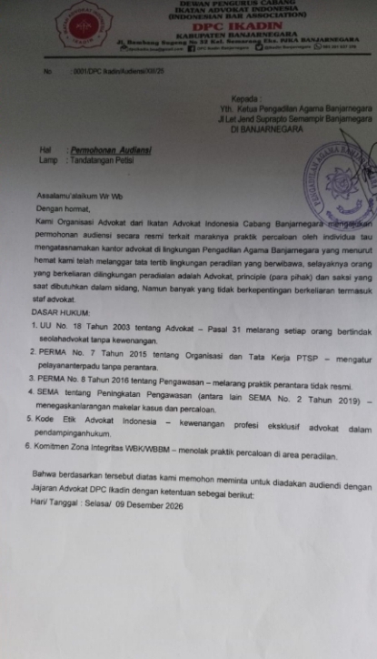 “ Kami sudah melayangkan surat audiensi yang isinya, meminta satu Minggu dari sekarang, agar kami berpendapat keluhan para pencari keadilan, adanya praktek percaloan dilingkungan Pengadilan Agama Banjarnegara, untuk segera ditertibkan,ada tata tertib selayaknya yang berkeliaran dilingkungan pengadilan adalah advokat yang sedang berperkara, principle (para Pihak) dan Saksi yang saat itu dibutuhkan dalam sidang,” tegas Supriyadi, SH Kepada awak media Senin (01/12-2025) kemarin.