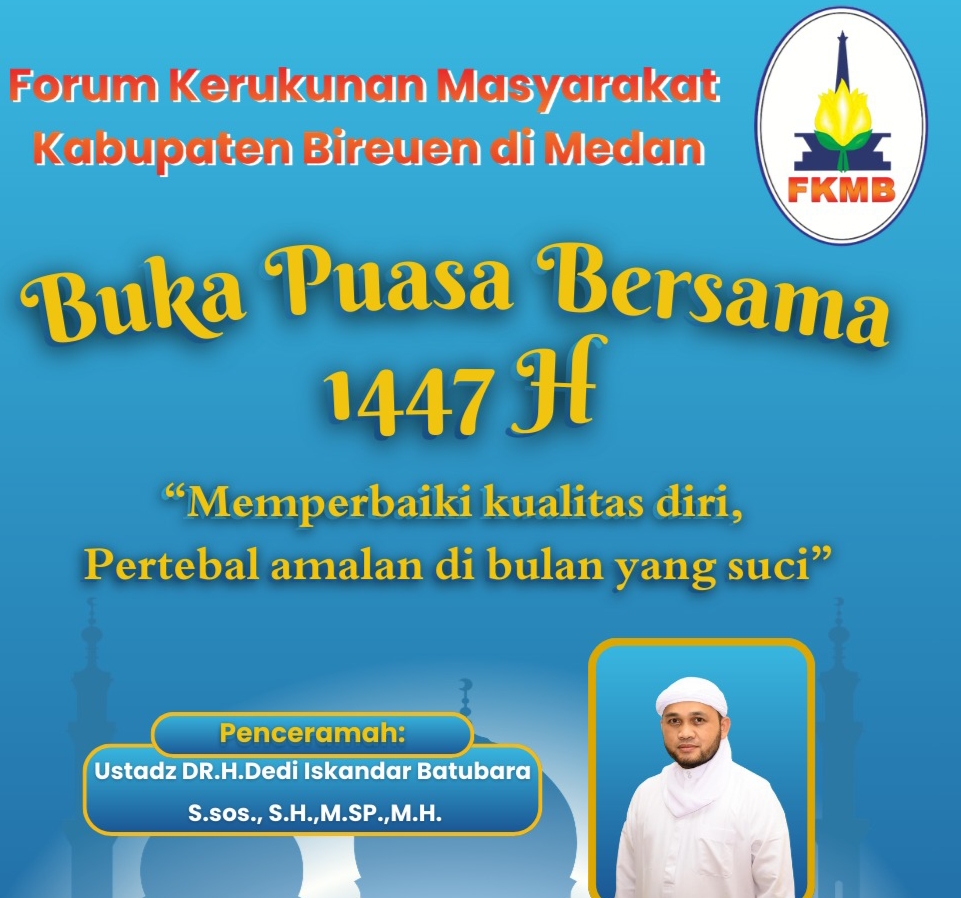 MabesNews.com-Forum Kerukunan Masyarakat Bireuen ( FKMB) Medan siap menggelar berbuka puasa bersama FKMB di Aula Hotel Grand Jamee Syariah, Jalan Ring Road Medan pada Hari Selasa 10 Maret 2026 pukul 18.00 WIB hingga selesai.