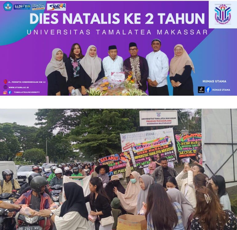 Lebih lanjut, Direktur Pascasarjana UTAMA, DR. H. Muh. Ilyas Nur, SKM., M.Adm.Kes. Menambahkan bahwa Acara Dies Natalis UTAMA tahun ini dilaksanakan dengan sangat antusias, terlihat dari banyaknya kehadiran tamu undangan dari berbagai pihak internal maupun eksternal dan juga banyaknya kiriman karangan bunga yang memenuhi halaman kampus UTAMA hingga ke bahu jalan trans sulawesi. Selain itu juga, pada hari puncak acara terlebih dahulu dilakukan pembagian takjil di depan Kampus UTAMA di Jl. Perintis Kemerdekaan Km. 12 dan diberikan kepada setiap pengendara motor maupun mobil yang melintas di depan Kampus Universitas Tamalatea Makassar di jelang waktu berbuka puasa. Setelah itu dilanjutkan dengan pemotongan tumpeng yang menjadi acara puncak sebagai tanda ucapan Syukur Dies Natalis ke-2 Universitas Tamalatea Makassar. Pemotongan tumpeng dilakukan oleh Rektor UTAMA bersama Ketua Senat UTAMA didampingi oleh Pengurus Yayasan dan unsur pimpinan UTAMA. Acara tersebut juga diisi dengan ceramah islamiyah dan diakhiri dengan Doa Penutupan yang disampaikan oleh Bapak Dr. Takdir Khair, S. Pd. M. Pd. (Dosen STAI Al-Furqan Makassar). Tutup Ilyas, Direktur Pascasarjana Kesamas.