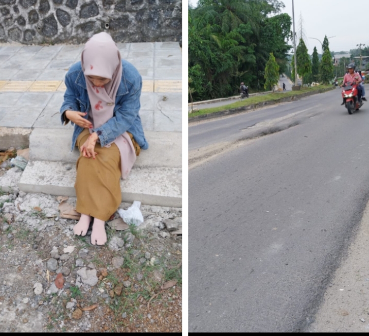 Di lokasi terlihat gundukan aspal yang pecah dan berkolam yang belum pernah diperbaiki.