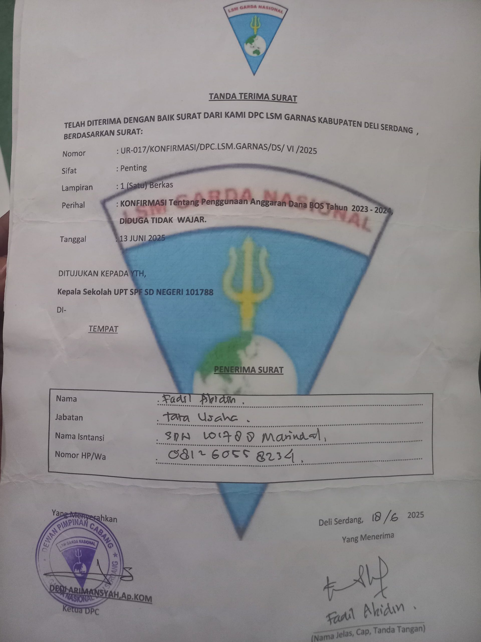 Kami menunggu klarifikasi dan konfirmasi dari pihak sekolah terkait surat LSM Garda Nasional kabupaten Deli Serdang ujar Eri Kardo Hutagalung, Sekretaris DPC LSM Garda Nasional kabupaten Deli Serdang.