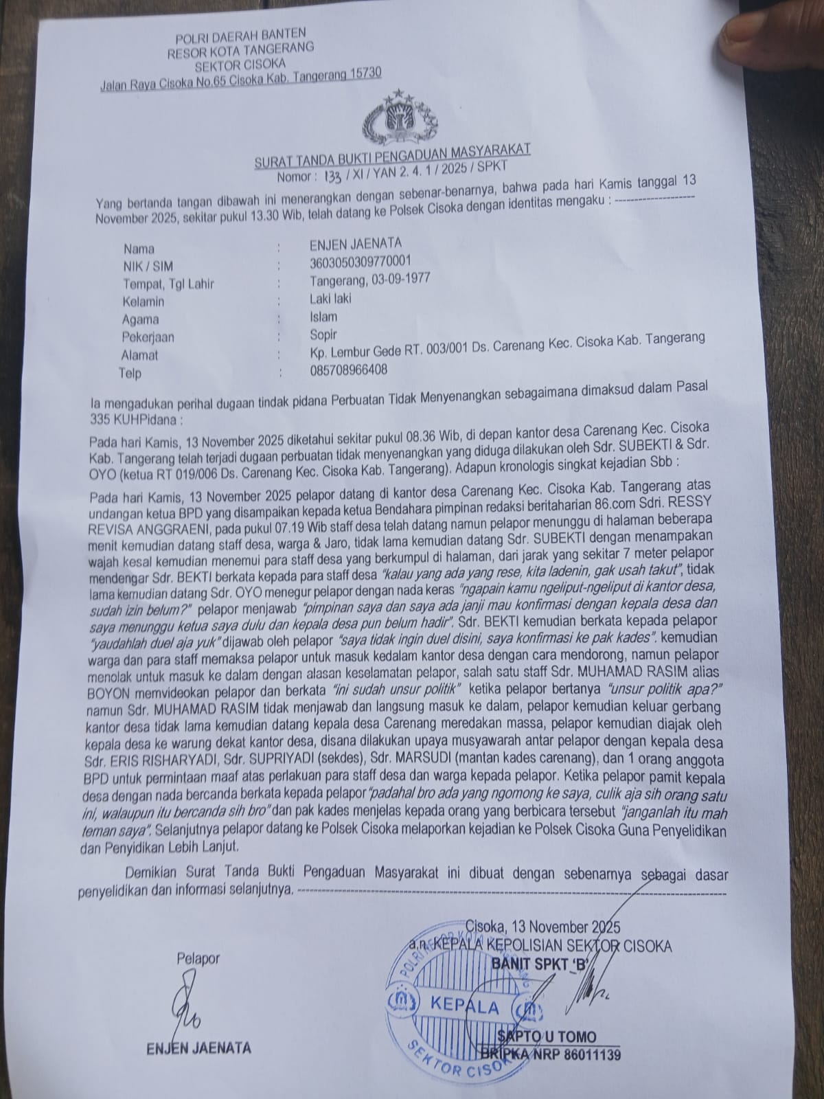 Atas insiden ini, pihak media melaporkan kejadian tersebut ke Polsek Cisoka karena merasa keselamatan mereka dan keluarga terancam.
