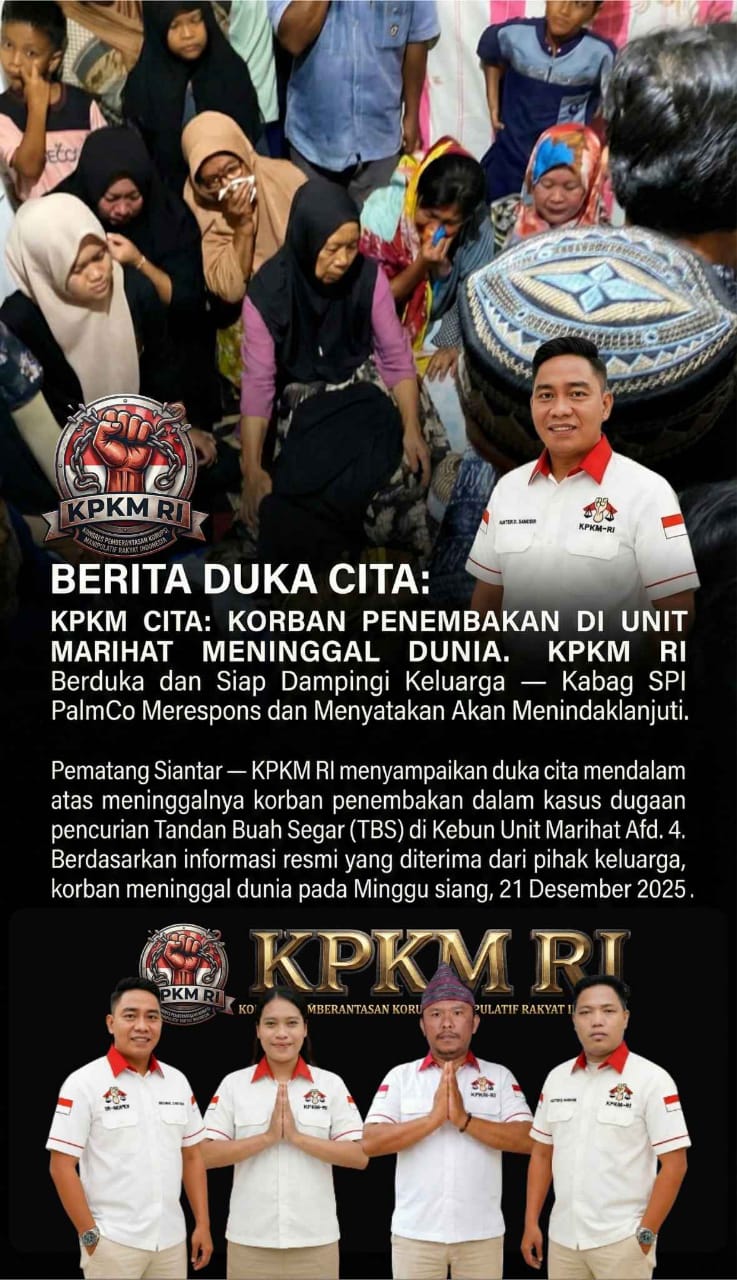 Mabesnews.com, Pematang Siantar – Sumut : Minggu 21 Desember 2025 – KPKM RI menyampaikan duka cita mendalam atas meninggalnya korban penembakan dalam kasus dugaan pencurian Tandan Buah Segar (TBS) di Kebun Unit Marihat Afd. 4.
