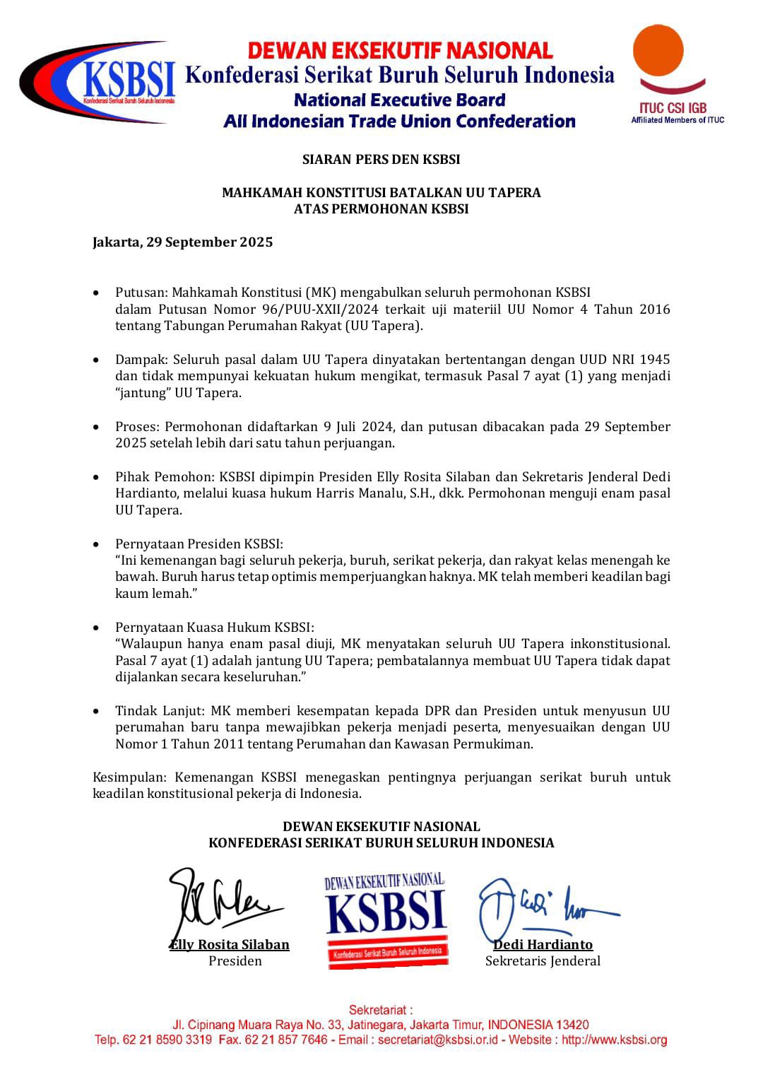 • Putusan: Mahkamah Konstitusi (MK) mengabulkan seluruh permohonan KSBSI dalam Putusan Nomor 96/PUU-XXII/2024 terkait uji materiil UU Nomor 4 Tahun 2016 tentang Tabungan Perumahan Rakyat (UU Tapera).