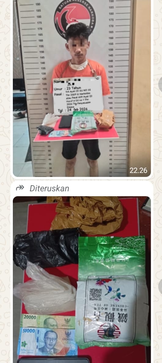 Petugas kemudian mengamankan seorang laki-laki berinisial M.M.Z. alias Z. Dari hasil penggeledahan, ditemukan satu bungkus plastik besar warna hijau bertuliskan “Chinese of Tea” berisi kristal putih diduga narkotika jenis sabu dengan berat netto sekitar 1.014,66 gram. Selain itu, turut diamankan barang bukti berupa lakban warna kuning, plastik kresek hitam dan putih, satu unit handphone Android merek POVA, serta uang tunai sebesar Rp70.000.