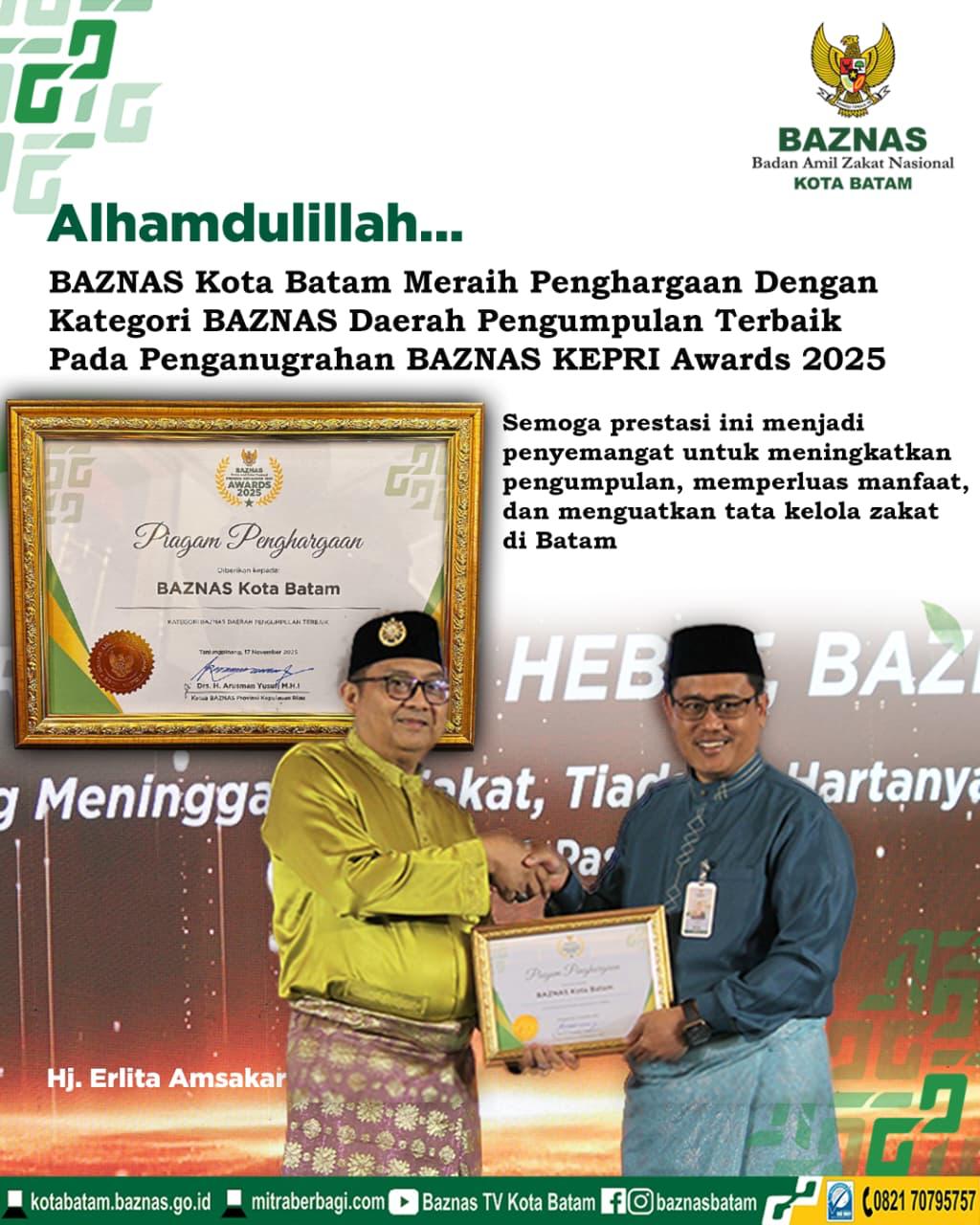Dengan penghargaan ini, diharapkan penguatan regulasi zakat ASN dan operasional BAZNAS terus meningkat untuk memberikan manfaat lebih luas bagi masyarakat.Sementara itu, BAZNAS Kota Batam kembali menorehkan prestasi gemilang dengan meraih penghargaan sebagai BAZNAS Daerah Pengumpulan Terbaik pada BAZNAS Kepri Awards 2025 yang digelar di Mercure Convention Center, Ancol, Jakarta.
