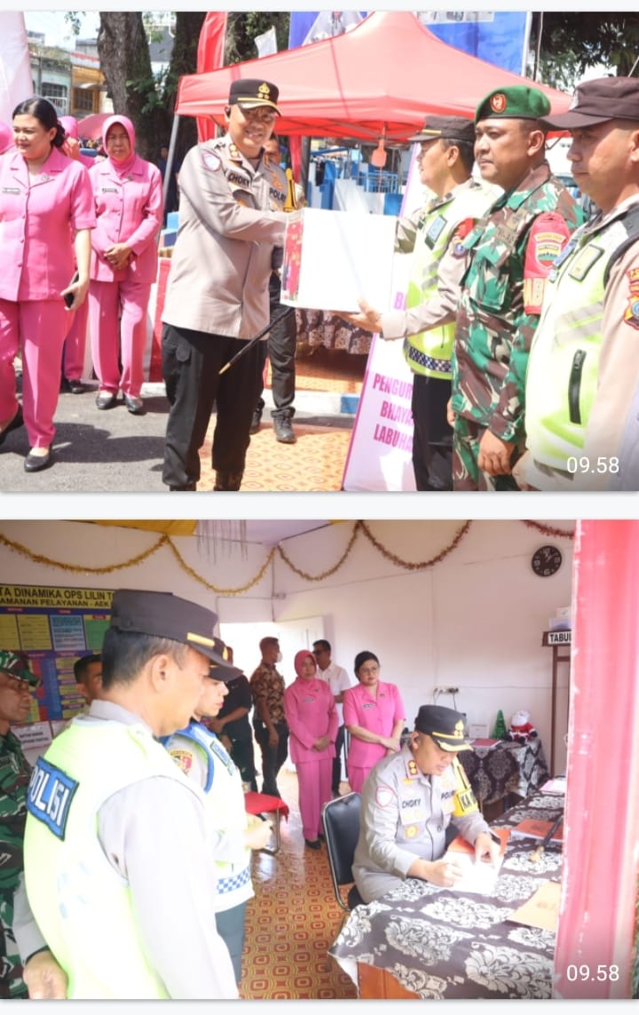 MabesNews.com, Labuhanbatu Utara Labura, Sumut – Kapolres Labuhanbatu AKBP Choky Sentosa Meliala, S.I.K., S.H., M.H. didampingi unsur Forkopimda, Pejabat Utama Polres Labuhanbatu serta pengurus Bhayangkari Cabang Polres Labuhanbatu melaksanakan pengecekan kesiapsiagaan Pos-pos Pengamanan Natal 2025 dan Tahun Baru 2026 di wilayah hukum Polres Labuhanbatu, Selasa (23/12/25).