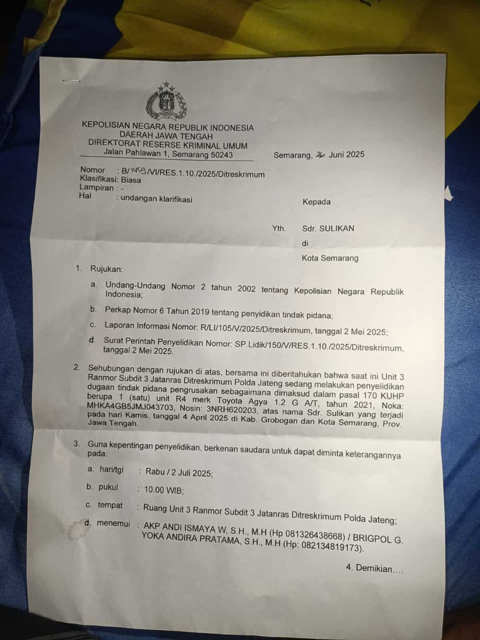 MabesNews.com, Warga Genuk, Kota Semarang, Sulikan, menerima surat panggilan klarifikasi dari Kepolisian Negara Republik Indonesia Daerah Jawa Tengah terkait dugaan tindak pidana pengrusakan satu unit mobil Toyota Agya. Namun, penerapan pasal 170 KUHP tentang pengeroyokan dalam surat panggilan tersebut menimbulkan pertanyaan, karena kasus yang dimaksud adalah pengrusakan, yang seharusnya diatur dalam Pasal 406 KUHP.
