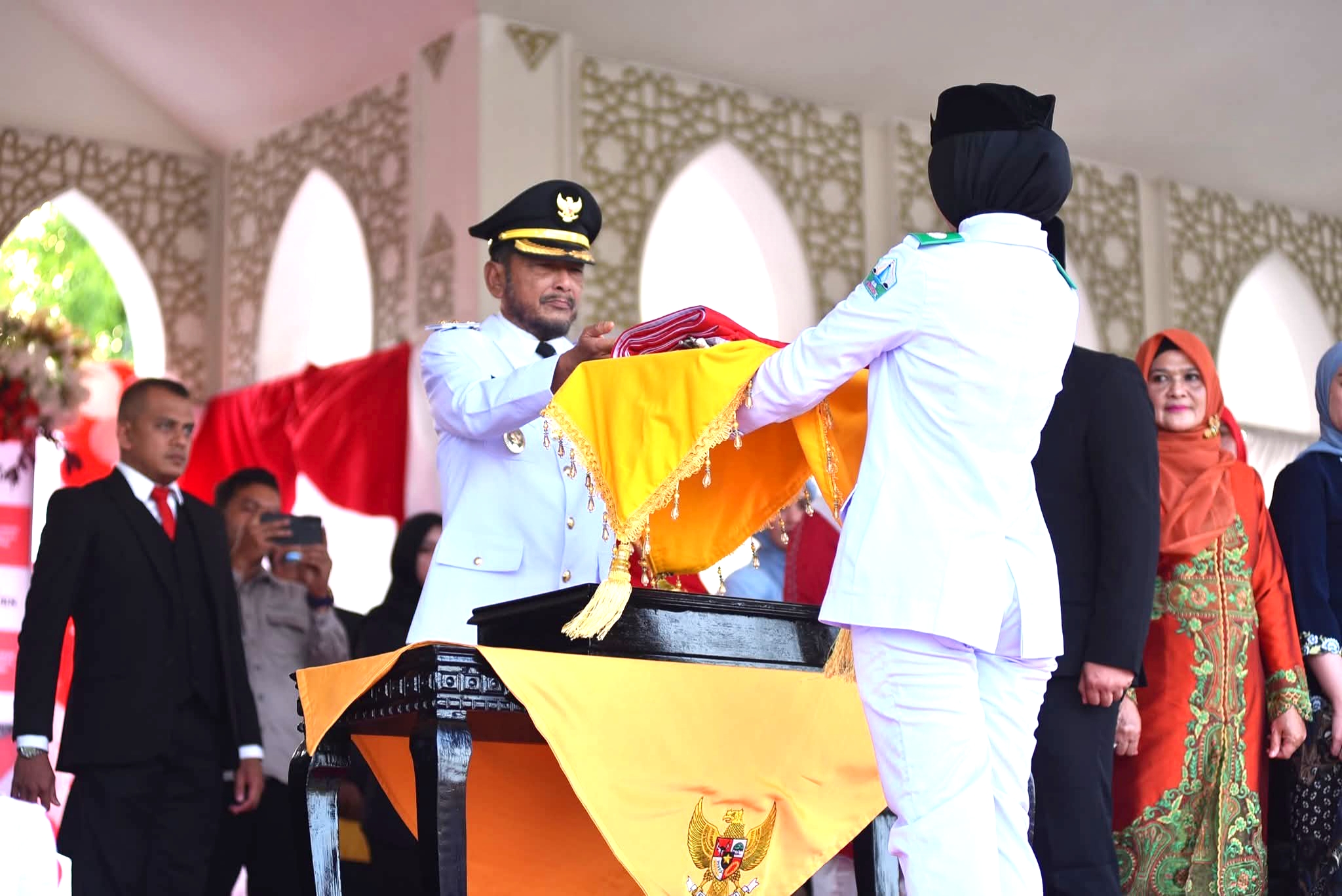 Upacara ini dihadiri oleh unsur Forkopimda, Sekda, ASN, TNI, Polri, Brimob, KNPI, Pramuka, mahasiswa, hingga pelajar. Ribuan masyarakat Bireuen turut menyaksikan secara langsung, memenuhi Lapangan cot gapu Kabupaten Bireuen sejak sebelum pukul 16.30 WIB.
