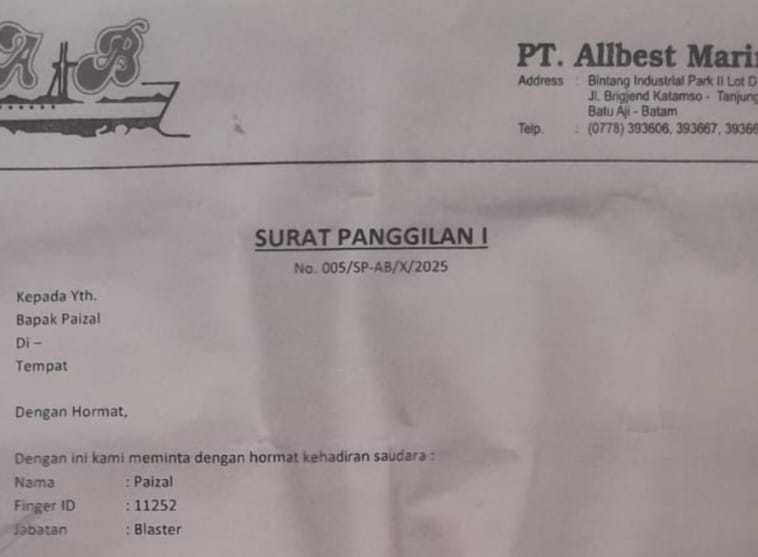Mabesnews.com, Batam — Dunia industri Batam kembali diguncang oleh kasus dugaan pemutusan hubungan kerja (PHK) sepihak yang dialami seorang pekerja PT Allbest Marina Batam bernama Paizal. Kasus ini bukan hanya menyorot nasib satu individu, melainkan membuka tabir tentang lemahnya kepatuhan perusahaan terhadap hukum ketenagakerjaan dan prinsip keadilan sosial di sektor industri.