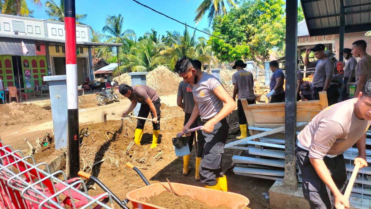 Dengan penuh semangat, personel Polri bersama warga bahu-membahu membersihkan lumpur yang mengendap di dalam ruangan pelayanan, kamar pemeriksaan, garasi, hingga area lingkungan sekitar Polindes.