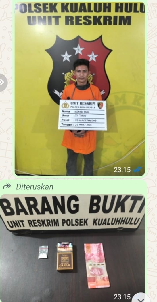 Selanjutnya pada hari Minggu tanggal 29 Maret 2026 sekira pukul.12.00 Wib, Atas perintah Kapolsek Kualuh Hulu AKP CITRA YANI Br BARUS, S.H, M.H. tim dipimpin Kanit Reskrim IPDA RAMADHAN HILAL, S.E., S.H melaksanakan penyelidikan dan tim melakukan pemantaun dan selanjutnya melihat ada 3(tiga) orang yang berboncengan dengan sepeda motor dan singgah diwarung, selanjutnya salah seorang turun dari sepeda motor hendak ke warung dan tim berhasil mengamankan 1(satu) orang laki dan selanjutnya melakukan penggeledahan badan dan ditemukan dari kantong celana sebelah kiri 1(satu) bungkus plastik klip transparan yang didalamnya berisikan yang diduga Narkotika jenis sabu-sabu, sementara 2(dua) orang temannya berhasil melarikan diri, dan selanjutnya tim melakukan interogasi dan laki-laki tersebut mengaku bernama ALPEBRI PASAI Alias PEBRI dan ianya mengakui BB tersebut diperolehnya dari yang bernama JONI SIANIPAR, dan selanjutnya tim mencari keberadaan JONI SIANIPAR tersebut namun tim tidak berhasil menemukannya.