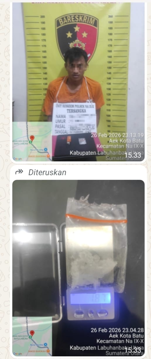 MabesNews.com, Labuhanbatu Utara Labura, Sumut – Polsek Na IX-X Polres Labuhanbatu kembali menunjukkan komitmennya dalam memberantas peredaran narkotika. Pada Kamis malam, 26 Februari 2026, sekitar pukul 21.00 WIB, personel Polsek Na IX-X berhasil mengungkap kasus penyalahgunaan narkotika jenis sabu di sebuah rumah kosong di Lingkungan V Purwosari, Kelurahan Aek Kota Batu, Kecamatan Na IX-X, Kabupaten Labuhanbatu Utara. Jum’at (27/02/2026)