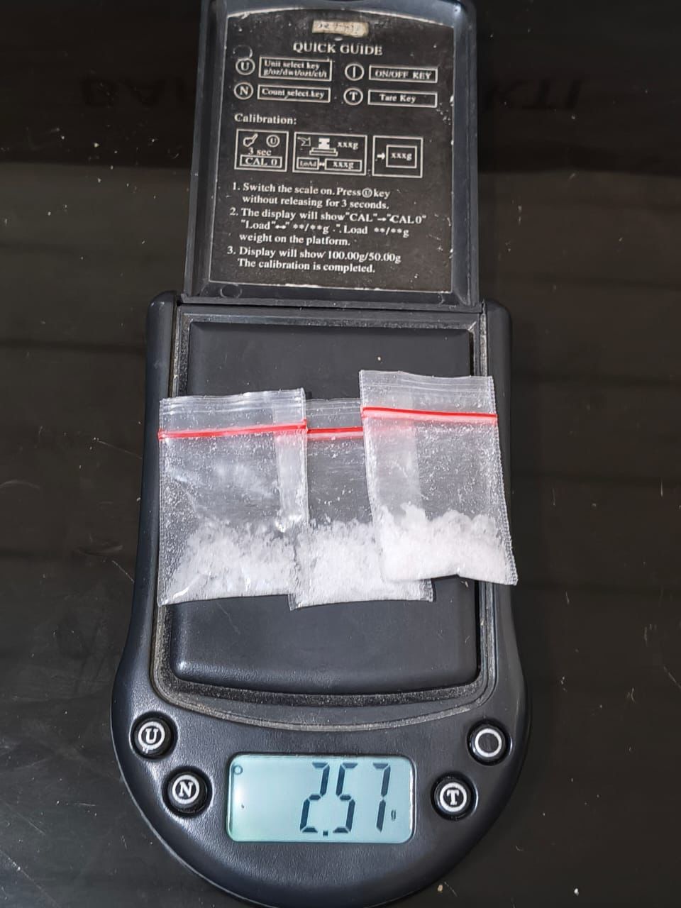 Dari tangan pelaku, petugas mengamankan barang bukti berupa 3 (tiga) bungkus plastik klip sedang berisi narkotika jenis sabu dengan berat bruto 2,57 gram, 1 (satu) bungkus plastik klip besar transparan kosong, 12 (dua belas) bungkus plastik klip kecil kosong dan uang tunai sebesar Rp105.000 yang diduga hasil penjualan sabu.