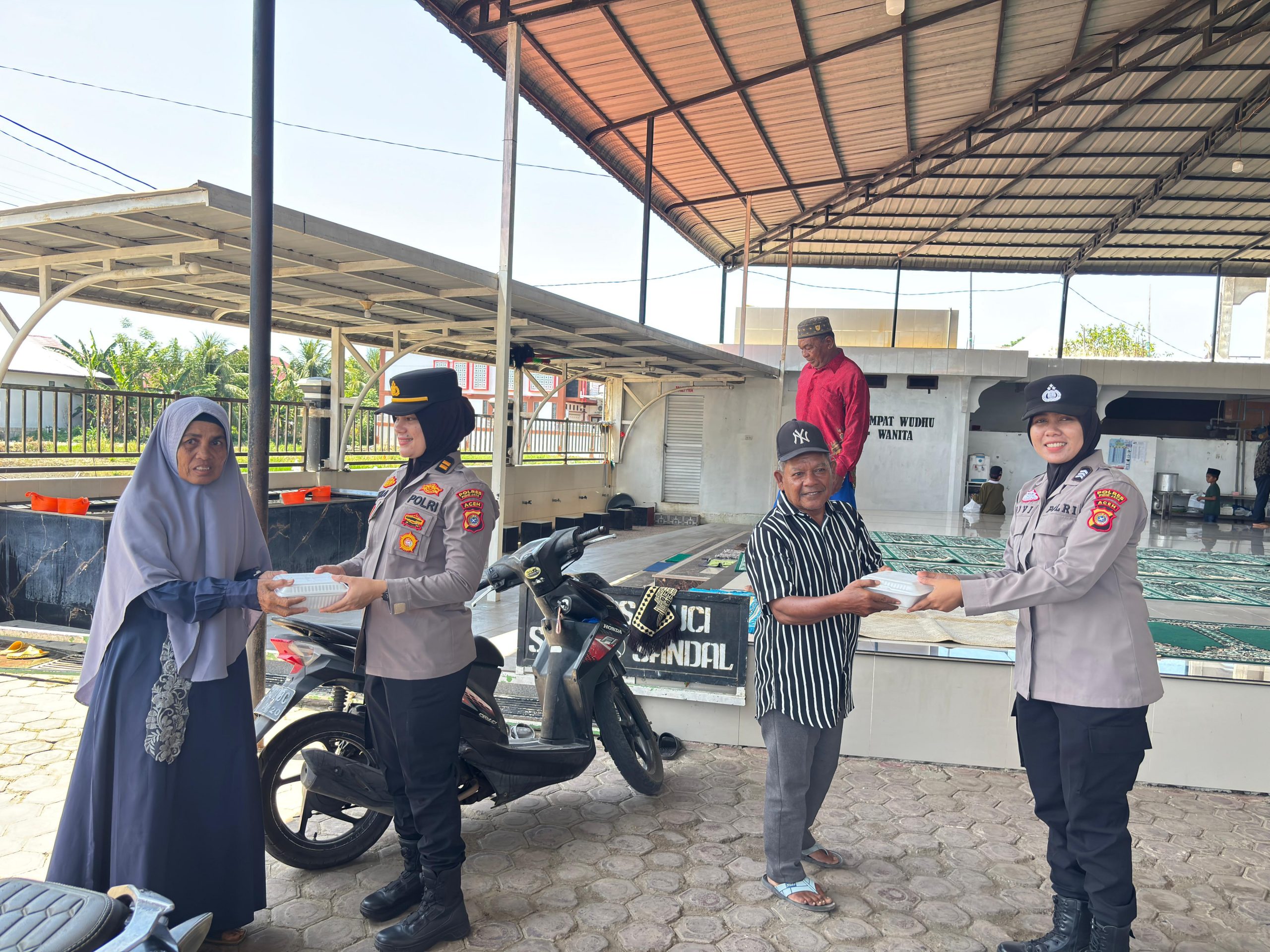 Dipimpin langsung oleh Kasubbag Watpers Bag SDM Polres Pidie Jaya, IPTU Nina Ervianti, S.H., M.H., para Polwan turun langsung membagikan nasi kotak kepada jemaah masjid, warga kurang mampu, dan anak-anak di sekitar lokasi.