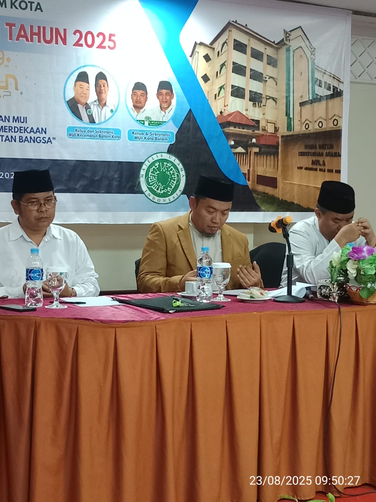 Kegiatan Rapat Kerja MUI Kecamatan Batam Kota ini telah sukses diselenggarakan pada hari Sabtu, 23 Agustus 2025, bertempat di PIH Batam Center. Acara dimulai sejak pukul 08.00 WIB hingga selesai dan dihadiri oleh jajaran pengurus, tokoh masyarakat, serta tamu undangan, termasuk perwakilan dari Pimpinan Daerah MUI Kota Batam.