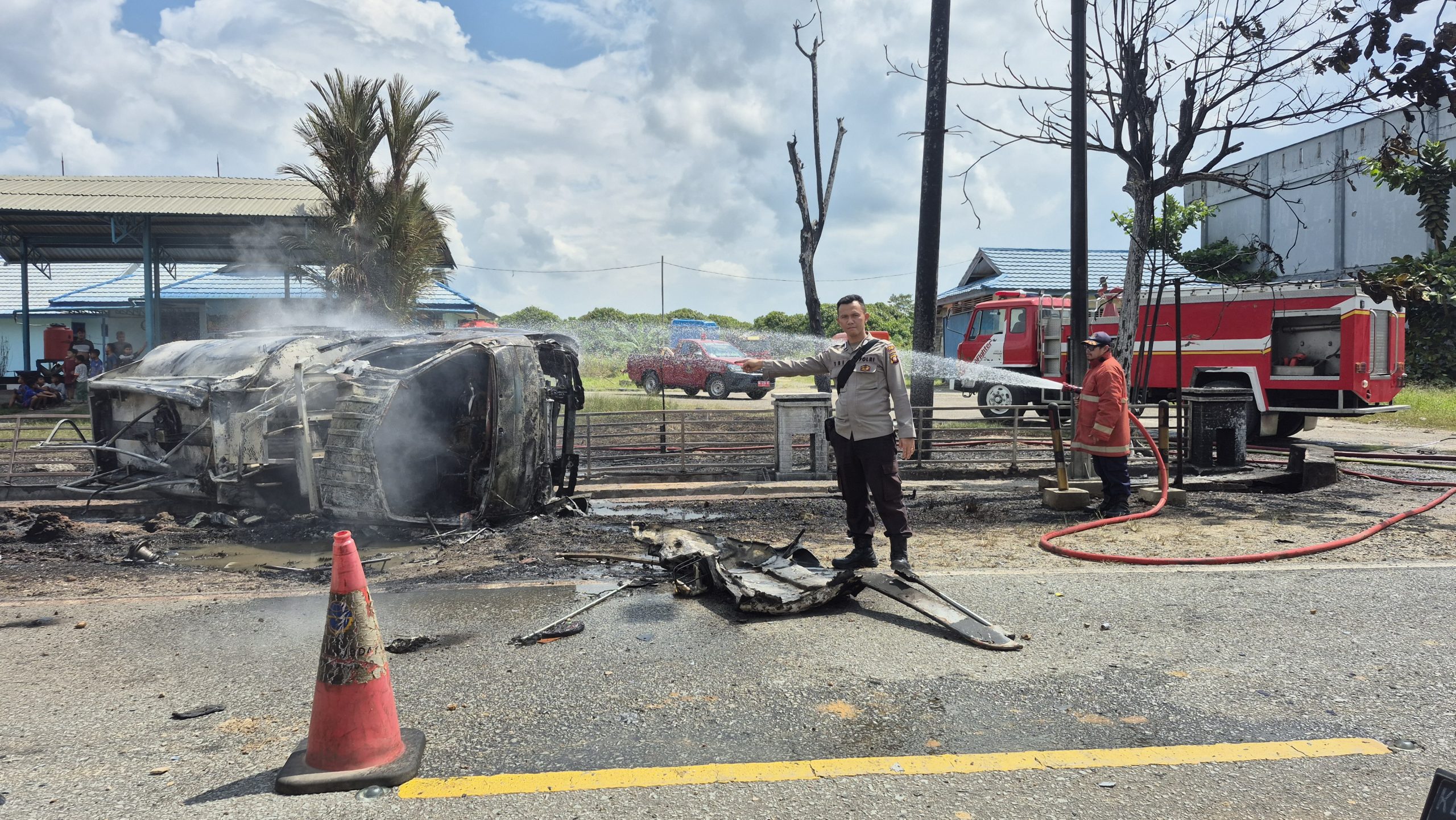 Dan pas di area timbangan mobil DisHUb kilometer 10 sungai Sawak mobil tangki sempat oleng dan seperti zig zag dan terjadilah laka lantas,mobil terbalik dan meledak,jelas anggota Brimob tersebut.