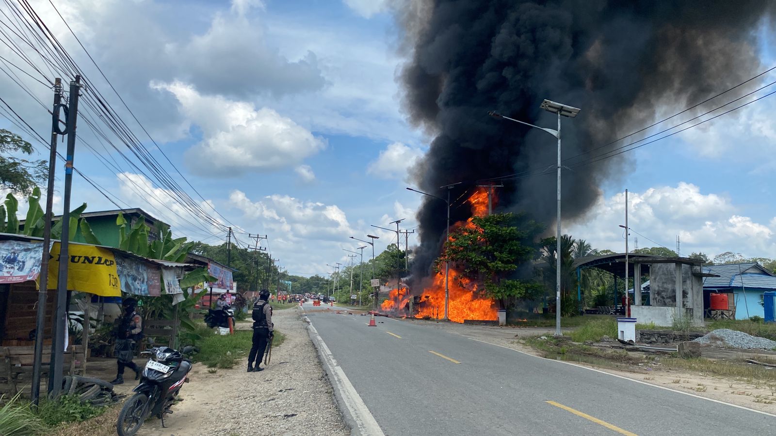 Kamis-17-Juli-2025 Akibat dari kecelakaan tunggal mobil tangki KB 8545 FB dan meledak yang terjadi di jalan poros Sintang Pontianak Kalimantan Barat kilometer 10 sungai sawak,saat kejadian pukul 11.30 WIB mengakibatkan arus jalan macet