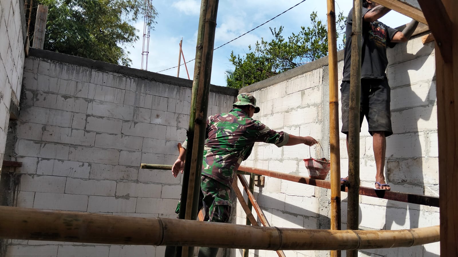 “Pekerjaan kali ini difokuskan pada pemasangan besi dan pengecoran sloof atas. Warga turut aktif membantu mulai dari mengaduk campuran hingga mengangkat material. Inilah bentuk nyata kemanunggalan TNI dengan rakyat,” ujarnya.