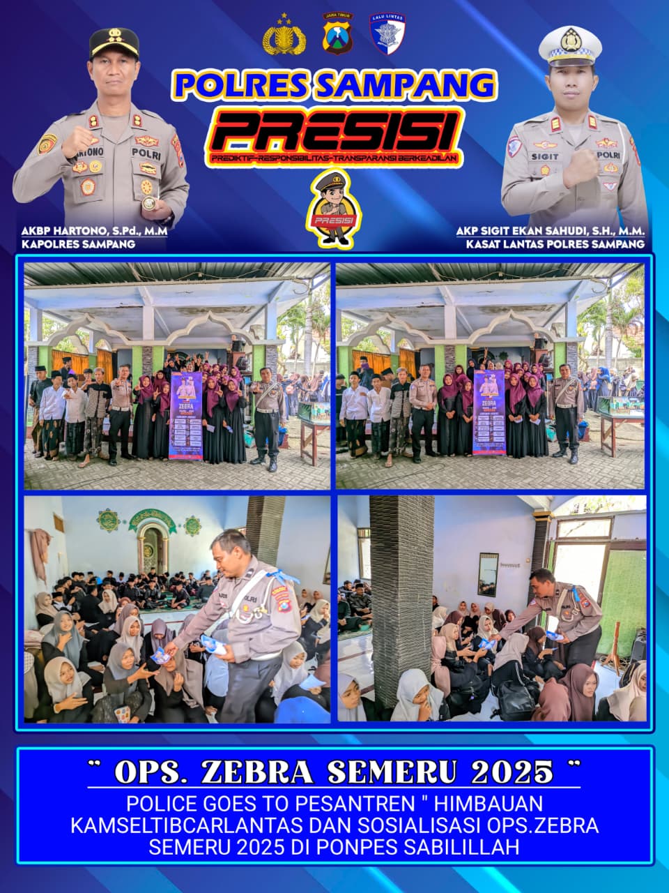 Mabesnews.Tv, SAMPANG,27 November 2025 – Satlantas Polres Sampang melaksanakan kegiatan sosialisasi Ops Zebra Semeru 2025 di Ponpes Darus Syahid Sampang pada hari Kamis, 27 November 2025. Kegiatan ini bertujuan untuk meningkatkan kesadaran dan kepatuhan masyarakat, khususnya para santri, dalam berlalu lintas.