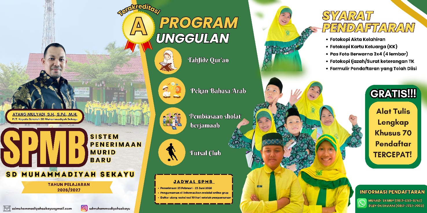 Dengan berbagai keunggulan tersebut, SD Muhammadiyah Sekayu menjadi salah satu pilihan tepat bagi orang tua yang menginginkan pendidikan berkualitas dan berkarakter bagi anak-anaknya.“Ayo bergabung bersama SD Muhammadiyah Sekayu, tempat tumbuhnya generasi cerdas, berakhlak, dan berprestasi,” tutup Atang.