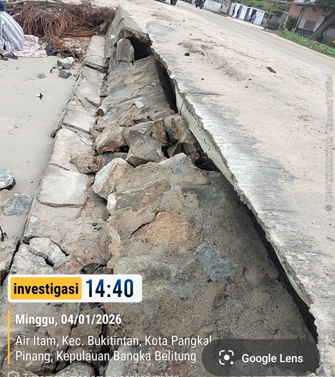 Berdasarkan pantauan lapangan pada Minggu (4/1/2026), dinding penahan jalan yang berfungsi melindungi akses utama jalan tersebut hancur berkeping-keping akibat hantaman gelombang air laut.