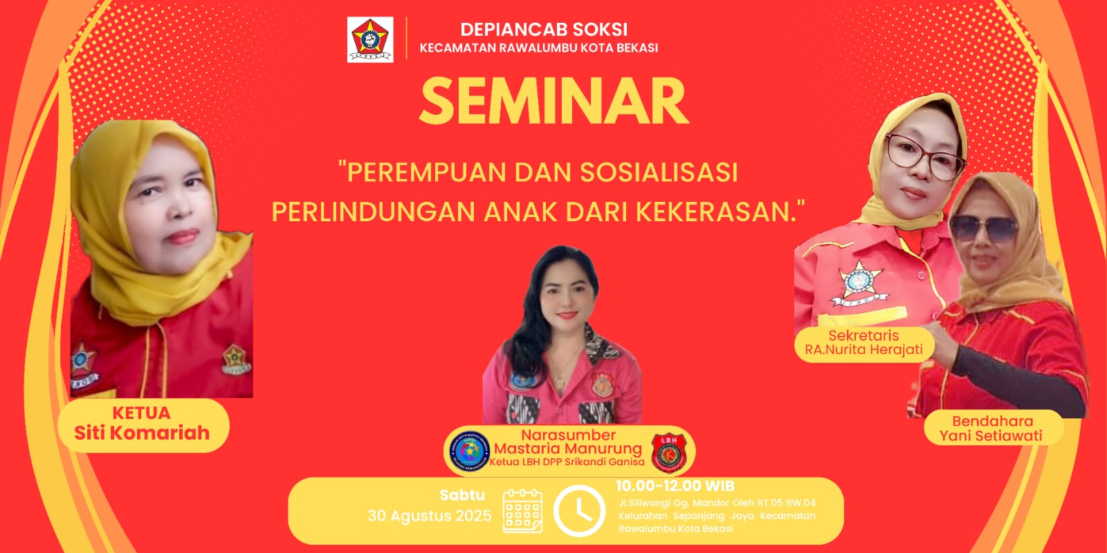 MabesNews.com, BEKASI, 11 Agustus 2025] – Lembaga Bantuan Hukum (LBH) DPP Srikandi Ganisa, di bawah kepemimpinan Mastaria Manurung, mengumumkan kolaborasi dengan Sentra Organisasi Karyawan Swadiri Indonesia (SOKSI) untuk menggelar seminar penting tentang perlindungan anak dan perempuan dari tindak kekerasan. Acara ini dijadwalkan pada 30 Agustus 2025, di Jalan Siliwangi Gang Mandor, RT 05 RW 04, Kelurahan Sepanjang Jaya, Kecamatan Rawalumbu, Kota Bekasi.