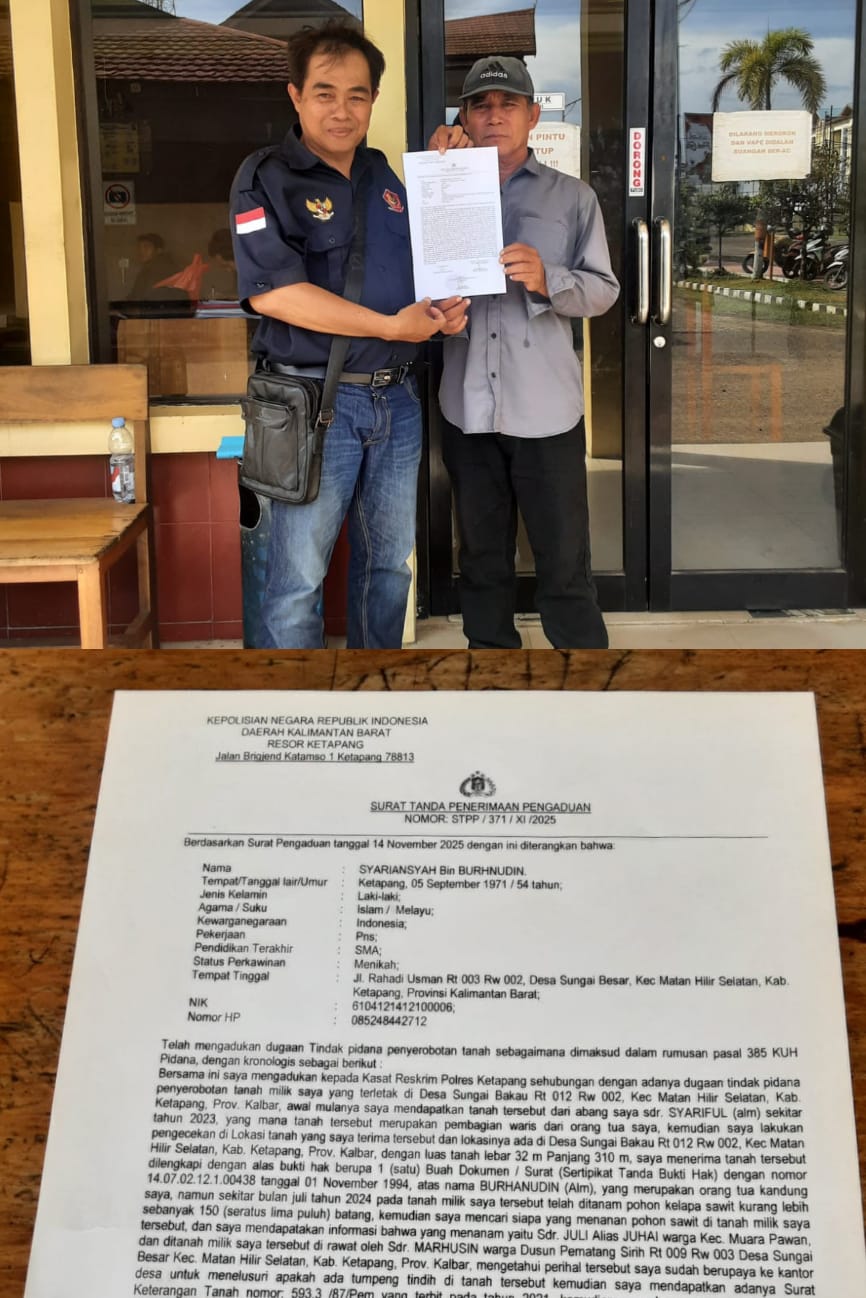 MabesNews.com, Ketapang, Kalimantan Barat – Syariansyah warga jalan Rahadi Usman, RT. 003/RW. 002, Desa Sungai Besar, Kecamatan Matan Hilir Selatan, Kabupaten Ketapang, Provinsi Kalimantan Barat, melapor ke Polres Ketapang atas dugaan penyerobotan tanah pribadi miliknya.