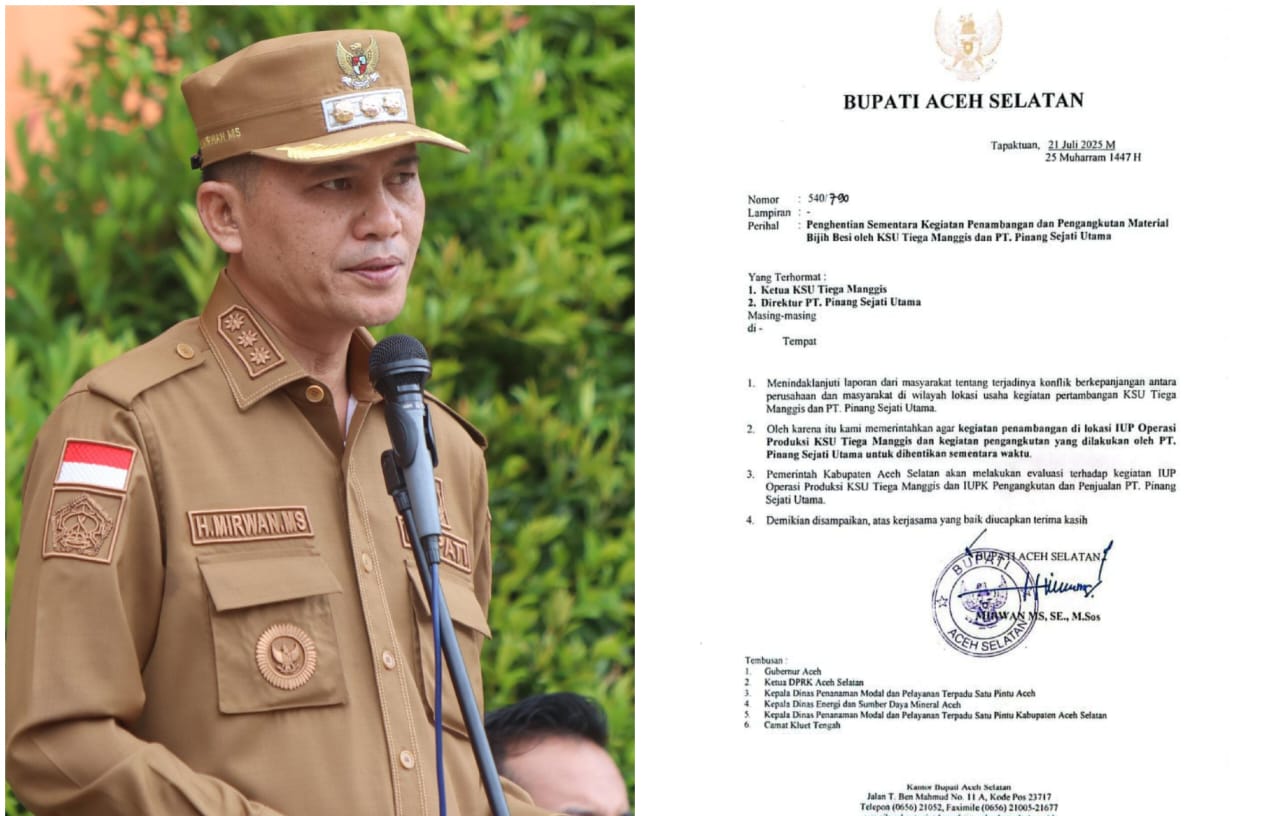 Penegasan itu disampaikan Bupati Aceh Selatan melalui surat nomor 540/790 tertanggal 21 Juli 2025 yang ditujukan langsung kepada Ketua KSU Tiega Manggis dan Direktur PT Pinang Sejati Utama.