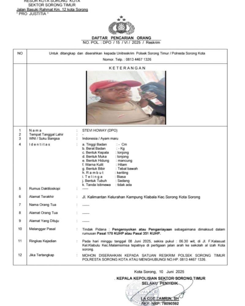 MabesNews.com, Sorong, Papua Barat Daya Aksi pengeroyokan terjadi pada Minggu (08/06/2025) sekira pukul 06.30 WIT di Jalan F. Kalasuat, Kelurahan Klabulu, Kecamatan Malaimsimsa, tepatnya di pertigaan jalan arah ke Sekolah Al Izah, Kota Sorong, (8/08/2025) Peristiwa tersebut melibatkan dua pelaku, salah satunya masih berstatus Daftar Pencarian Orang (DPO).