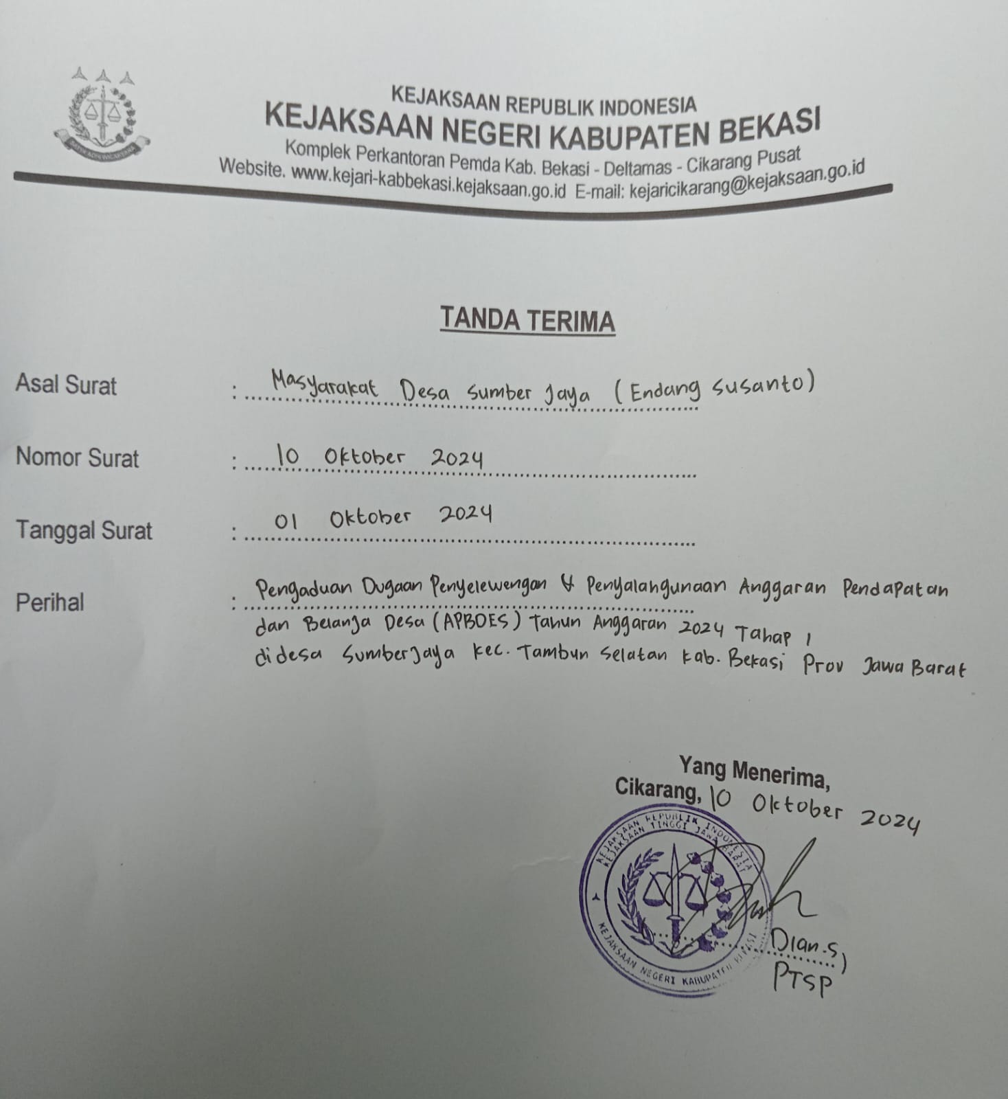 MabesNews.com,-Kab. Bekasi, – Dugaan penyalahgunaan dan penyelewengan Anggaran Pendapatan dan Belanja Desa (APBDes) Tahap I Tahun Anggaran 2024 di Desa SumberJaya, Kecamatan Tambun Selatan, yang kini sedang ditangani oleh Kejaksaan Negeri (Kejari) Cikarang, tengah menjadi perhatian masyarakat. Publik mendesak adanya kejelasan perkembangan kasus tersebut agar tidak berakhir sebagai wacana semata.