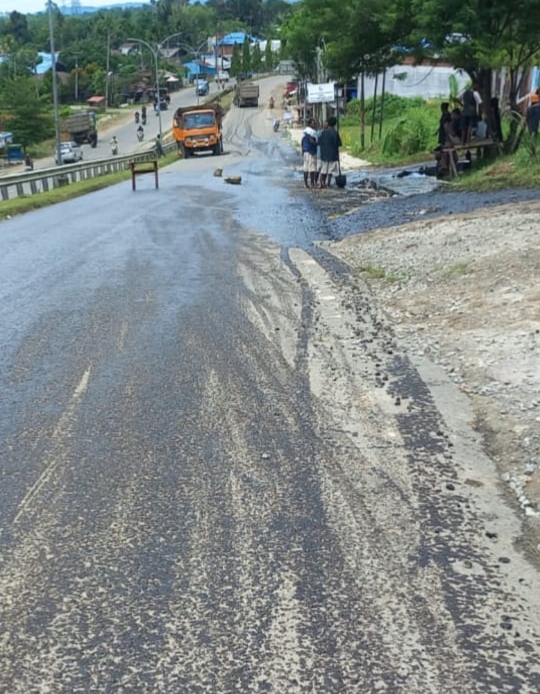 Tumpahan minyak mengalir deras dari area tanjakan Tunggu Powbili, membasahi badan jalan dan meluncur ke bagian bawah, menciptakan ancaman nyata bagi seluruh pengendara yang melintas. Kondisi ini memicu kekhawatiran besar di kalangan pengguna jalan, yang menyebut situasi tersebut sebagai “bom waktu” di jalur nasional itu.
