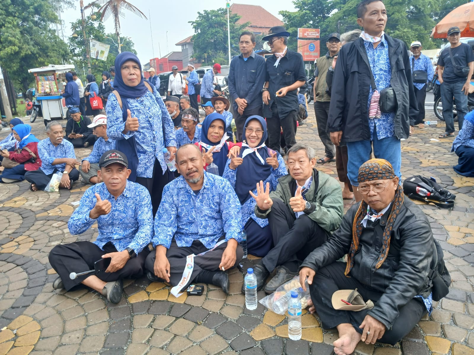 Di tengah kondisi hujan gerimis, para purnabakti ASN menggelar aksi unjuk rasa, sebagai luapan kekecewaan atas hak yang tak kunjung dipenuhi. Para pensiunan memprotes selisih pembayaran dana iuran KORPRI yang dinilai janggal.