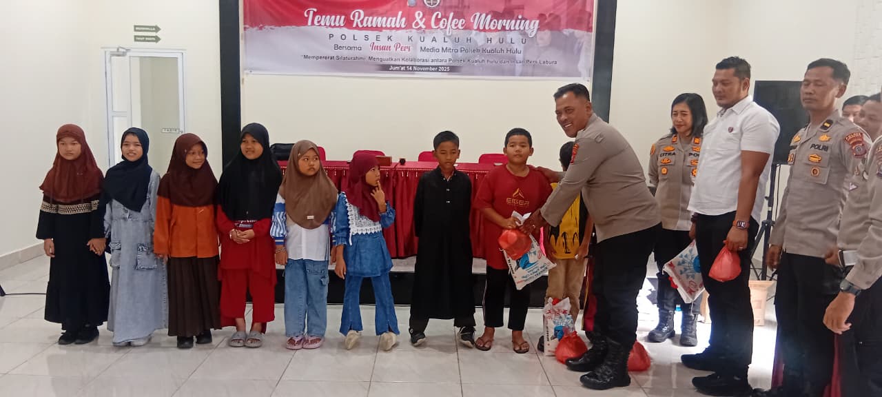 Dalam acara tersebut, Kapolsek kualuh hulu, AKP Citra Yani Br Barus SH MH menyampaikan acara memberi tali asih pada anak yatim, dan Coffee morning ini penting, selama kepimpinan saya, demi untuk menunjang kinerja saya, Selama bertugas di Mapolsek kualuh hulu ini, ungkap ibuk Kapolsek.